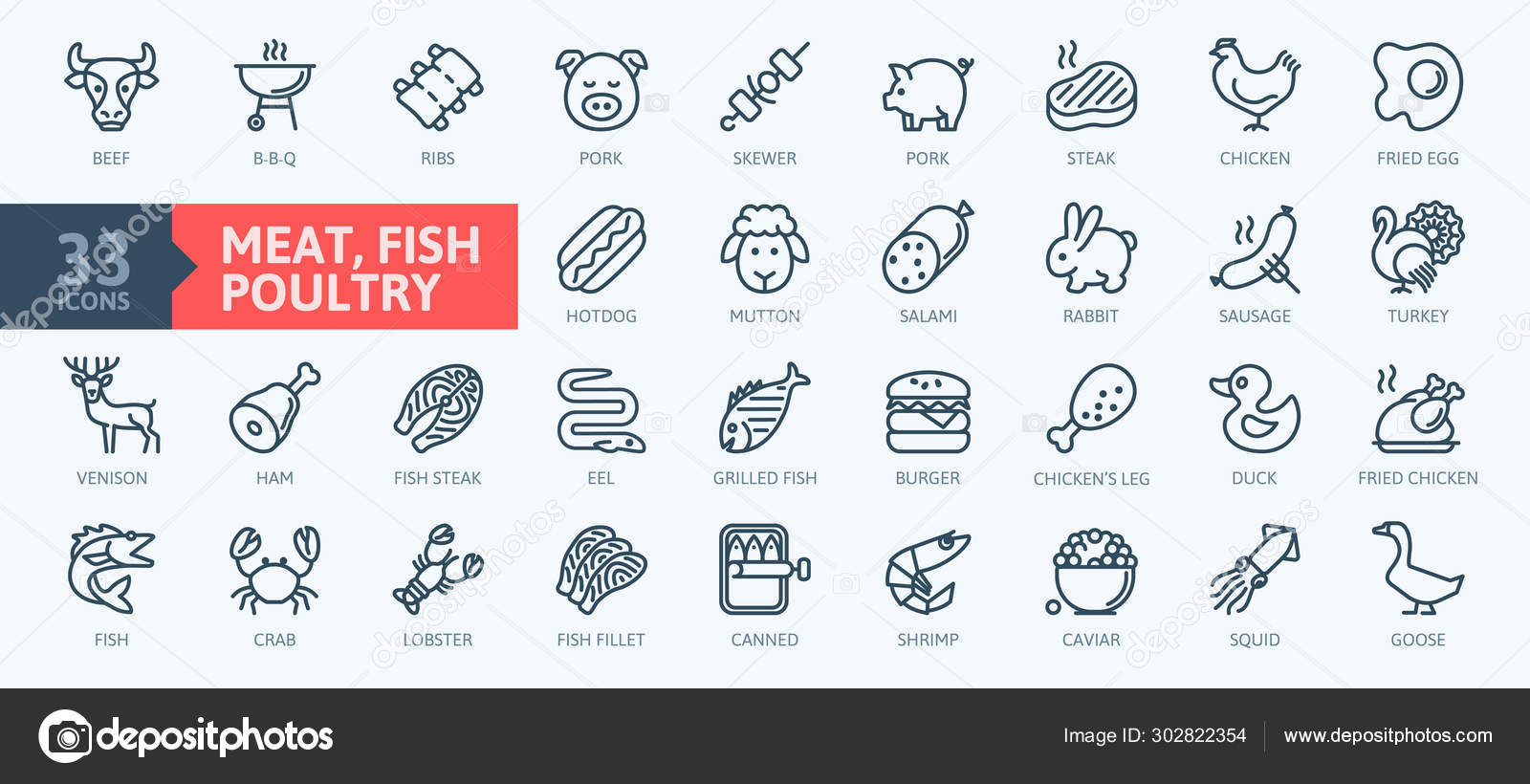Meat Poultry Fish Eggs Minimal Thin Line Web Icon Set Stock