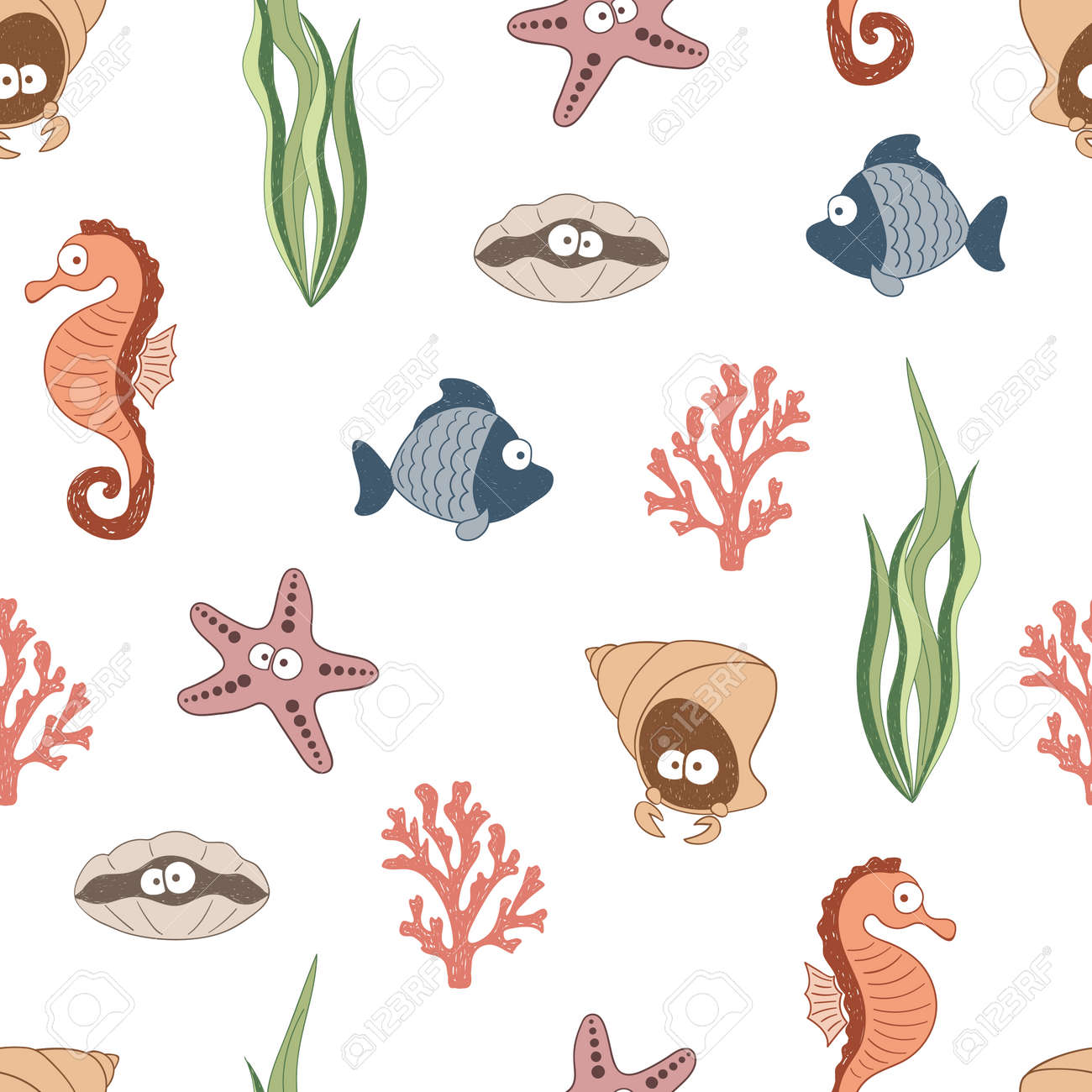 Cute Sea Animals Seamless Pattern Children Drawings Underwater