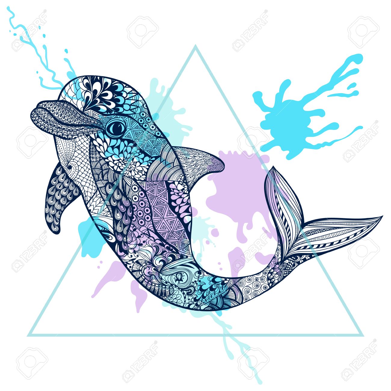 Zentangle Stylized Blue Dolphin In Triangle Frame With Watercolor