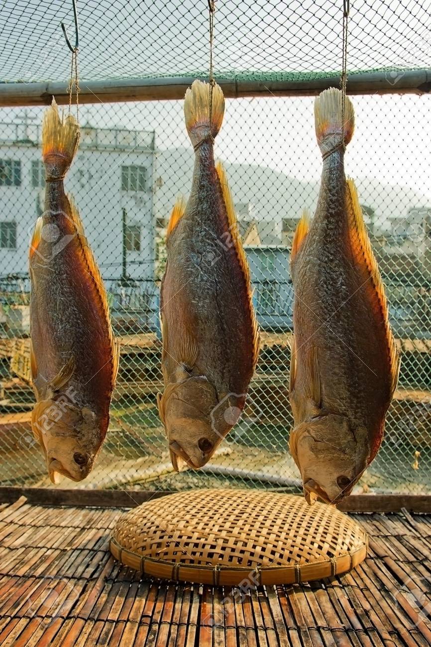 Preserved Fish Are Hanging Upside Down At A Market Stock Photo