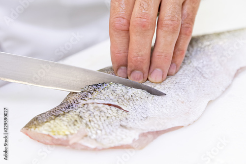 A Chef Scoring A Large Zander Fish Fillet With A Knife White