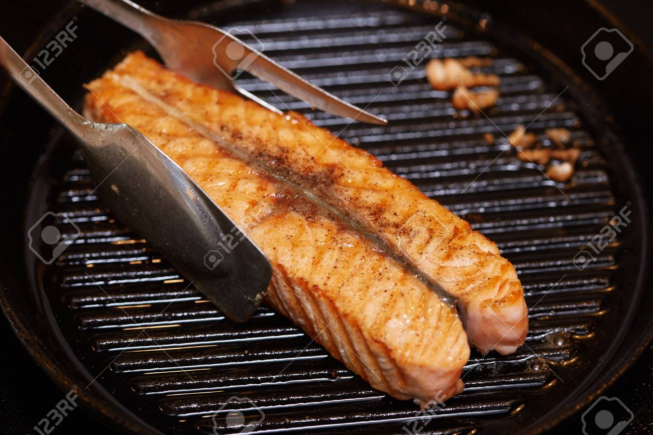 Cooking Process Salmon Steak Fish On The Grill Pan Stock Photo