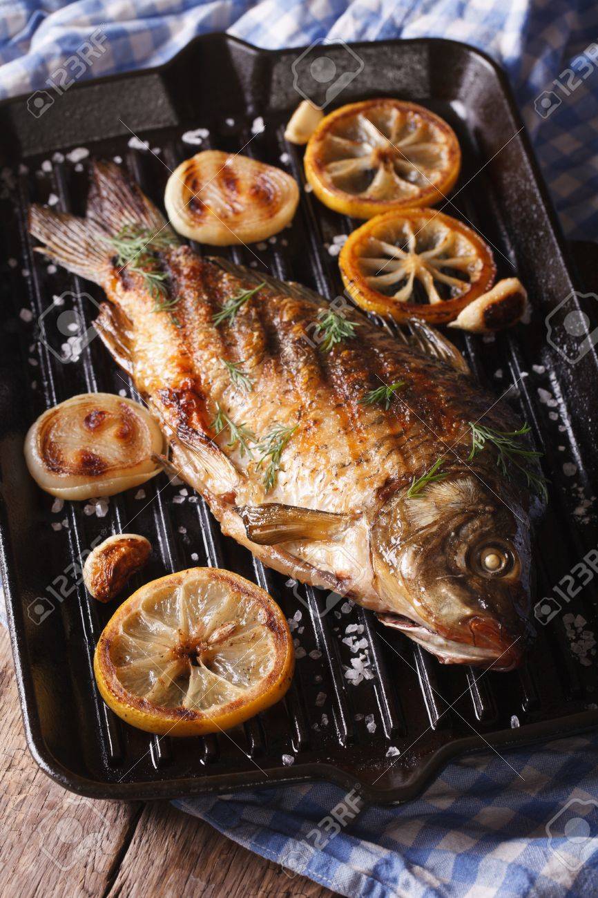 Fried Fish Carp With Lemon And Onion On Grill Pan Vertical Close
