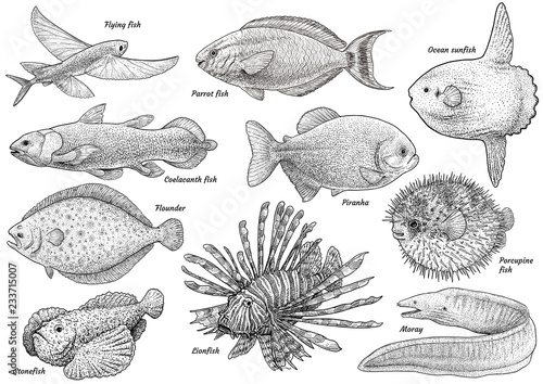 Tropical Fish Collection Illustration Drawing Engraving Ink